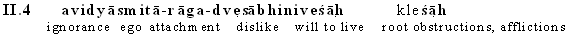 An interpretation: The root obstructions, or afflictions, that prevent us from becoming established in our true nature are: